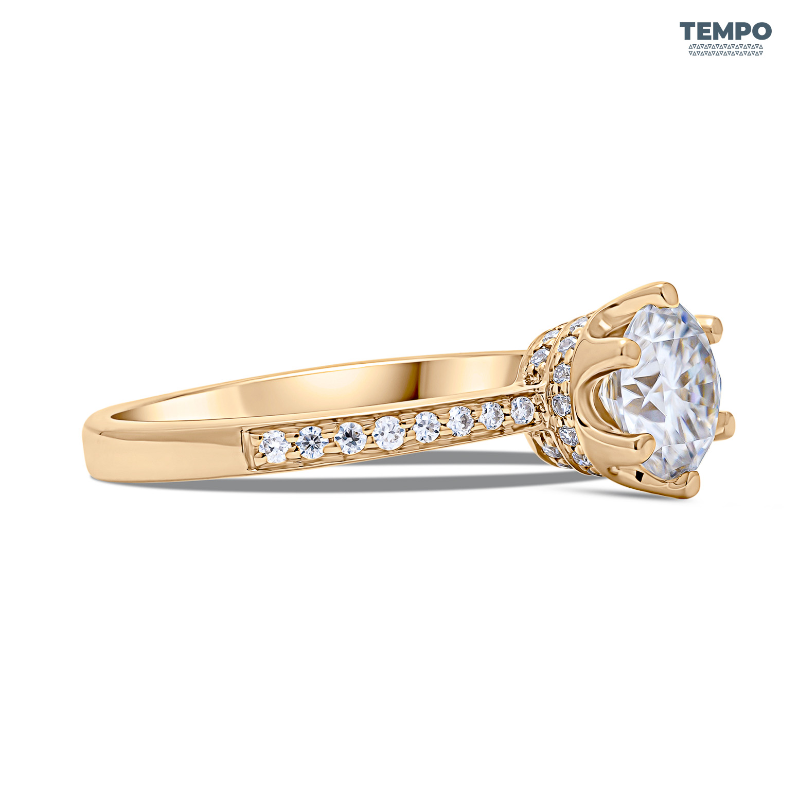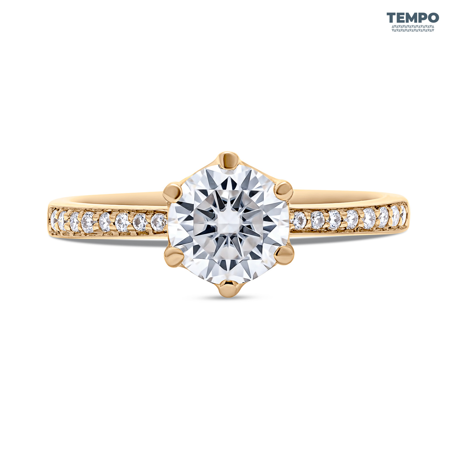 Diseño sofisticado con un brillo excepcional. Este anillo de compromiso en oro 10K presenta una imponente moissanita corte redondo, engastada en una elegante montura de seis garras tipo corona. La banda adornada con brillantes acentos laterales realza su resplandor, ofreciendo un equilibrio perfecto entre lujo y modernidad. Incluye una lujosa caja de regalo y envío a domicilio en todo el país.