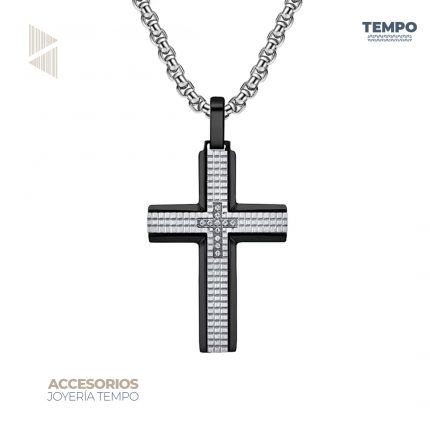 Collar para caballero en acero inoxidable 316L con dije de cruz en acabado black steel y centro texturizado tipo “frost”, que crea un contraste moderno y elegante. Una pieza distintiva, masculina y de estilo contemporáneo. Colección 2025. #TuEstiloTempo