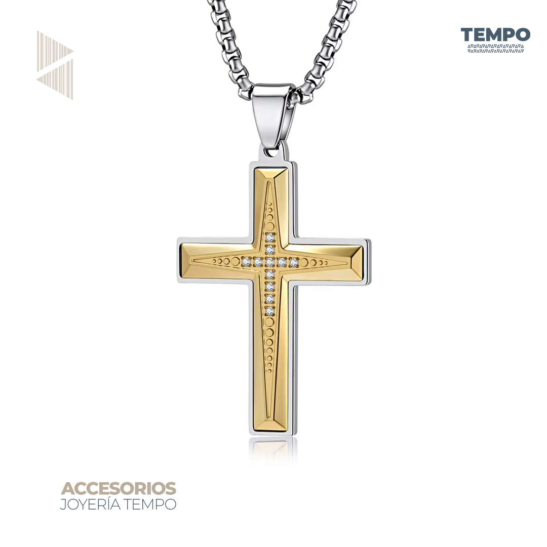 Collar para caballero en acero inoxidable 316L con dije de cruz en acabado dorado y plateado, realzado con detalles geométricos y una línea central de microbrillos que aporta elegancia y presencia. Una pieza llamativa, refinada y de estilo sofisticado. Colección 2025. #TuEstiloTempo