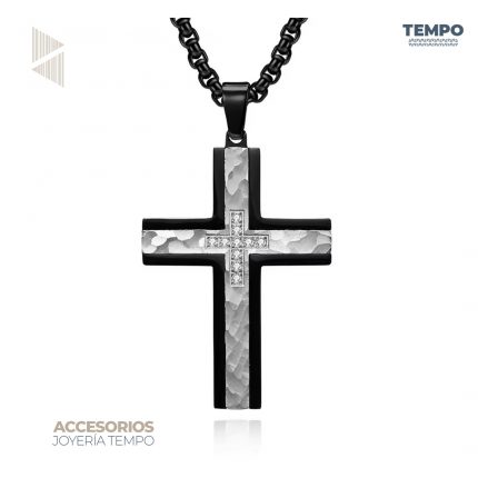 Collar para caballero en acero inoxidable 316L con placa estilo dog tag en contraste black steel y plata cepillada, destacada por líneas geométricas en relieve que aportan un look moderno, limpio y masculino. Colección 2025. #TuEstiloTempo