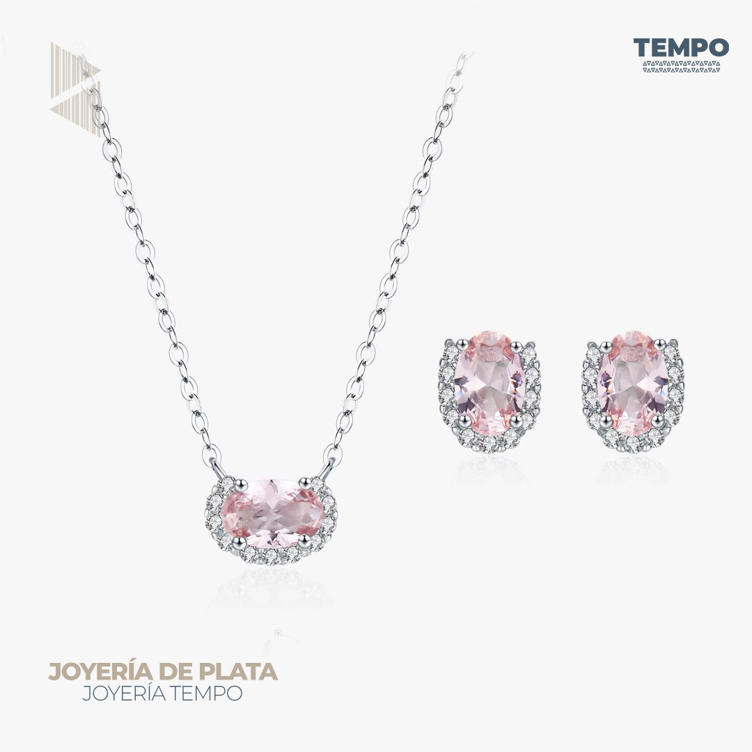 Conjunto de Plata 925 – Aritos y Collar – Cristal Rosa Kunzunita – COP59