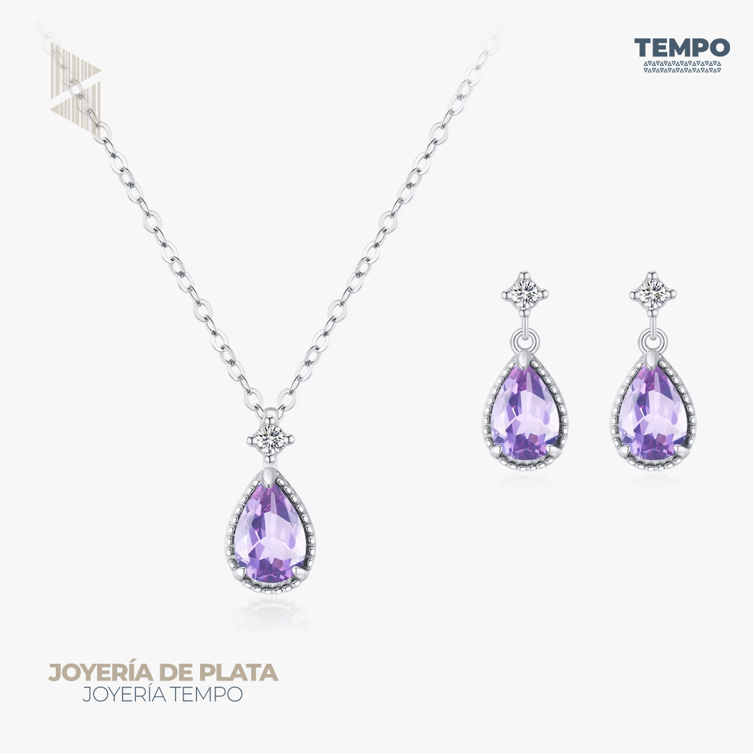 Conjunto de Plata 925 – Aritos y Collar – Gota de Amatista Lila – COP55