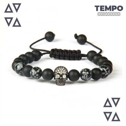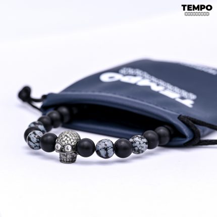 Pulsera para caballero elaborada en cuero negro de alta calidad, con placa central en acero inoxidable plateado de acabado brillante y detalles laterales de calaveras, que aportan un estilo fuerte y sofisticado. Incluye broche metálico de seguridad, ideal para un uso cómodo y diario. Un diseño moderno con carácter, perfecto para quienes buscan destacar con personalidad.