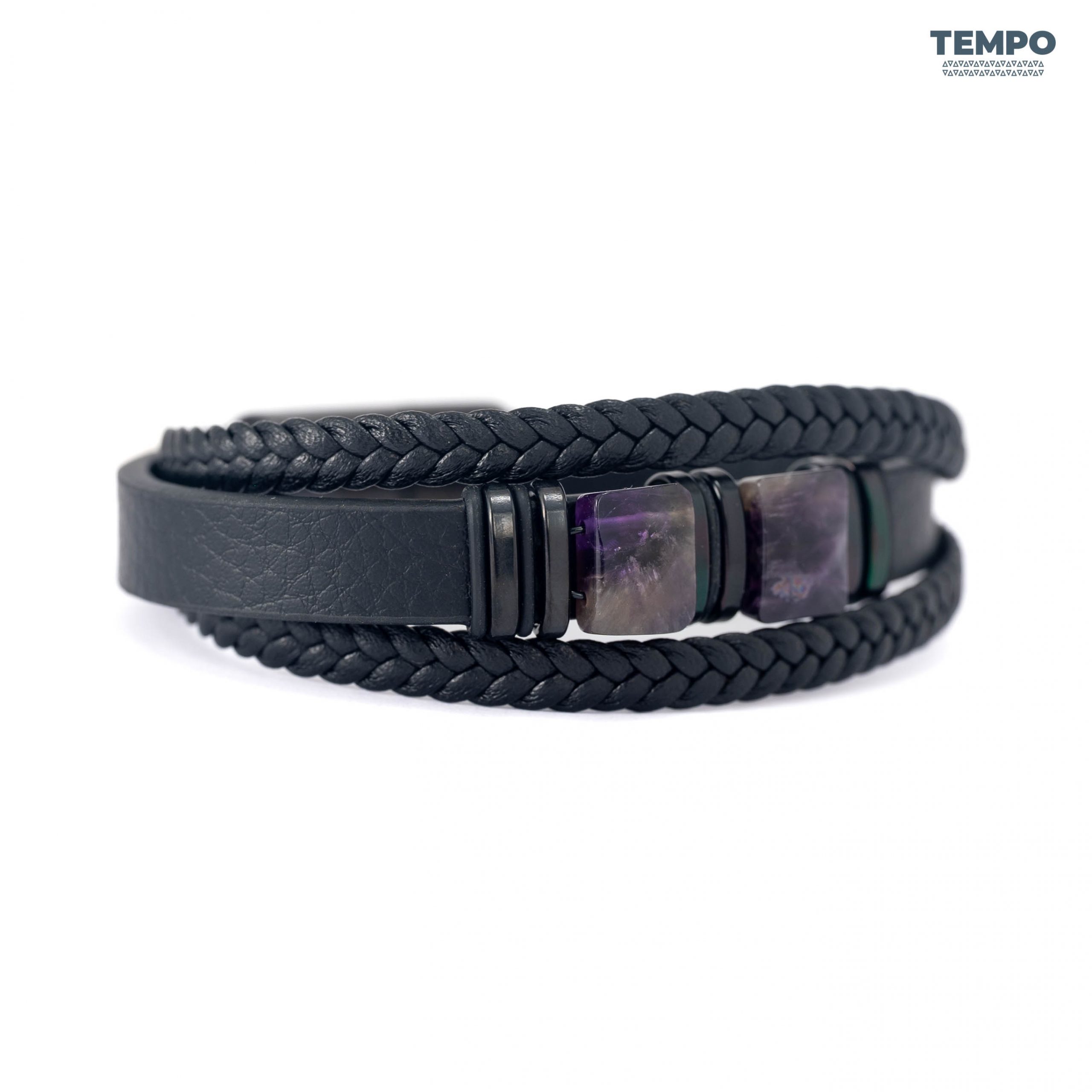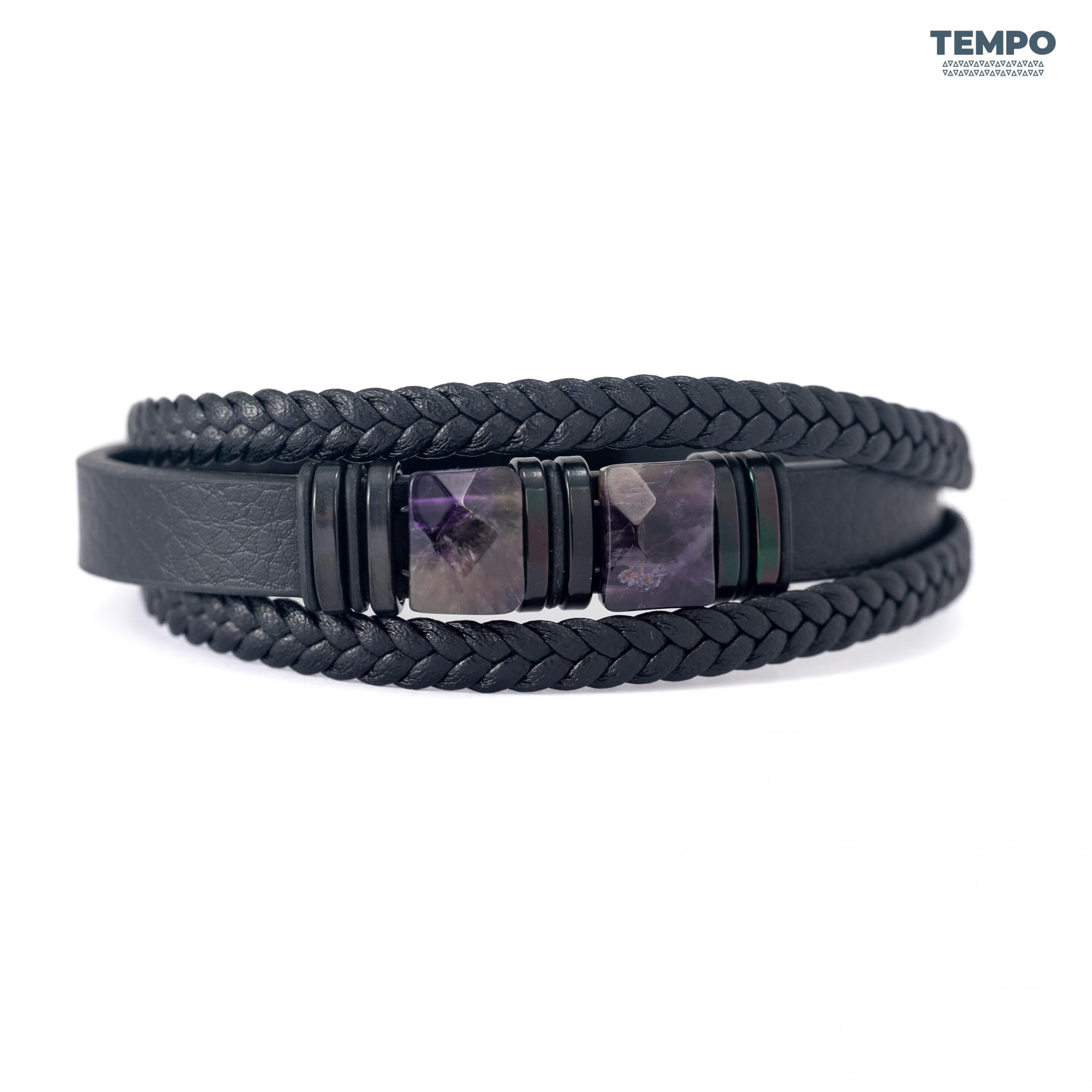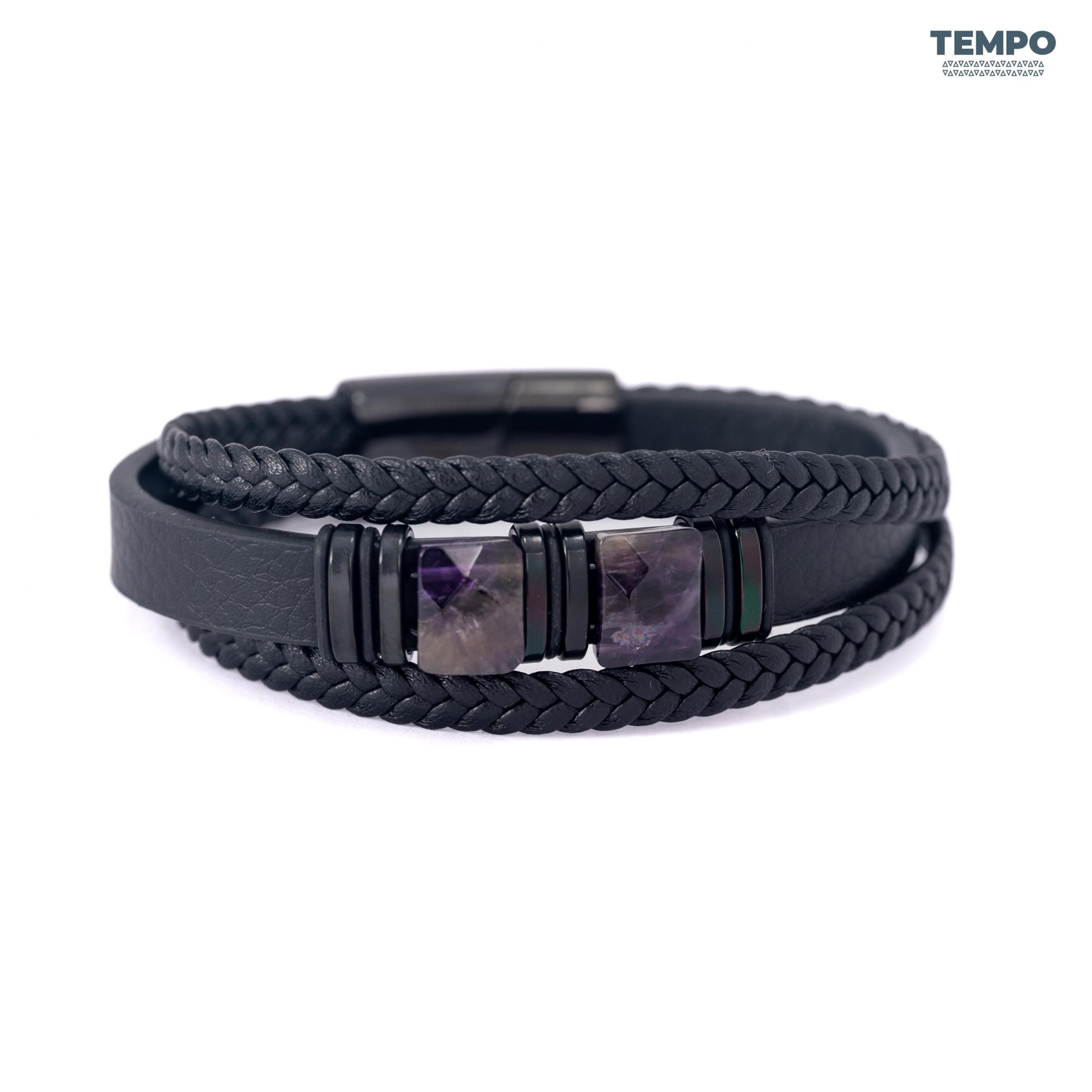Pulsera masculina de cuero con piedra natural Amatista, conocida por sus tonos púrpura y su apariencia sofisticada. Perfecta para dar un toque elegante y equilibrado a cualquier look, combinando sobriedad y personalidad en un diseño premium.