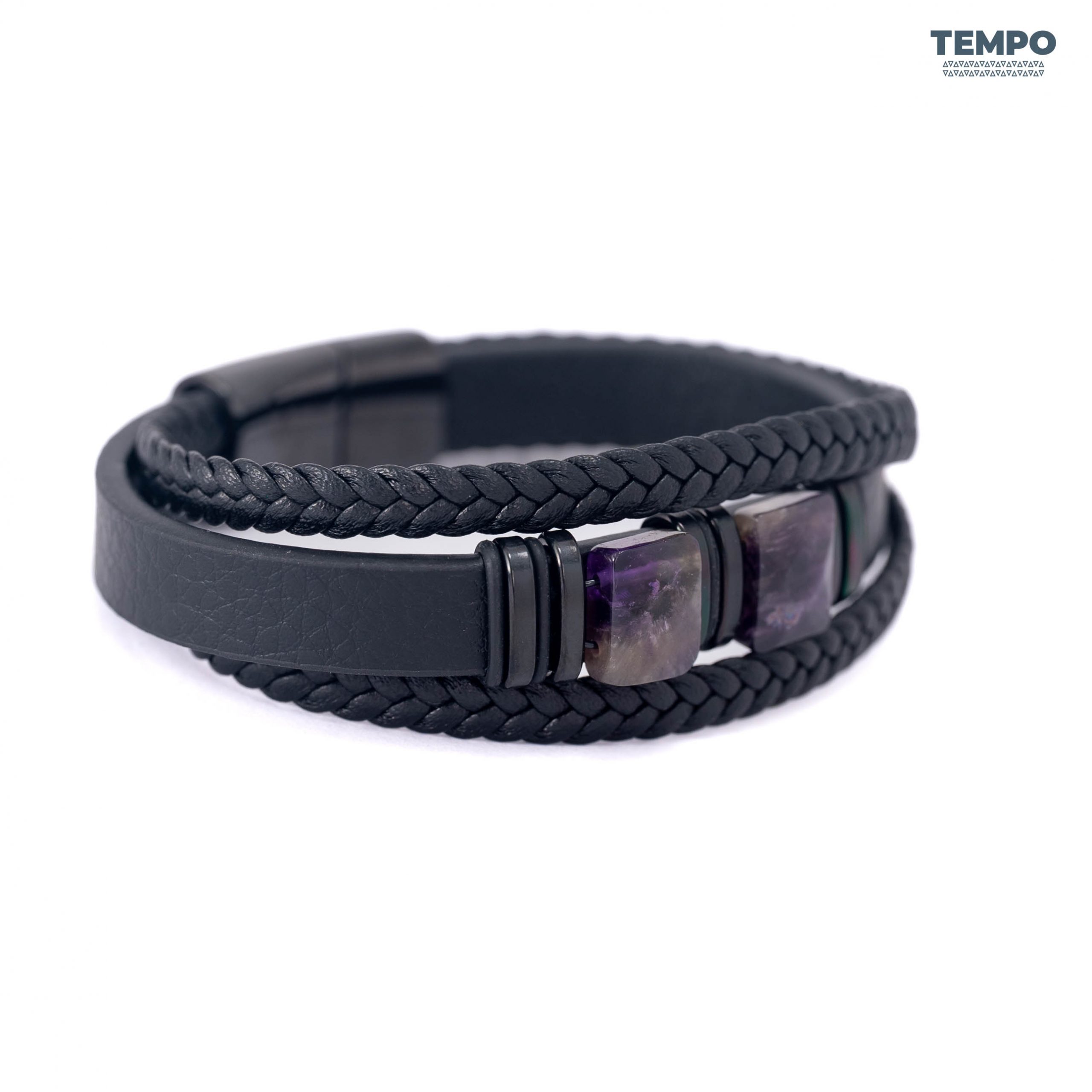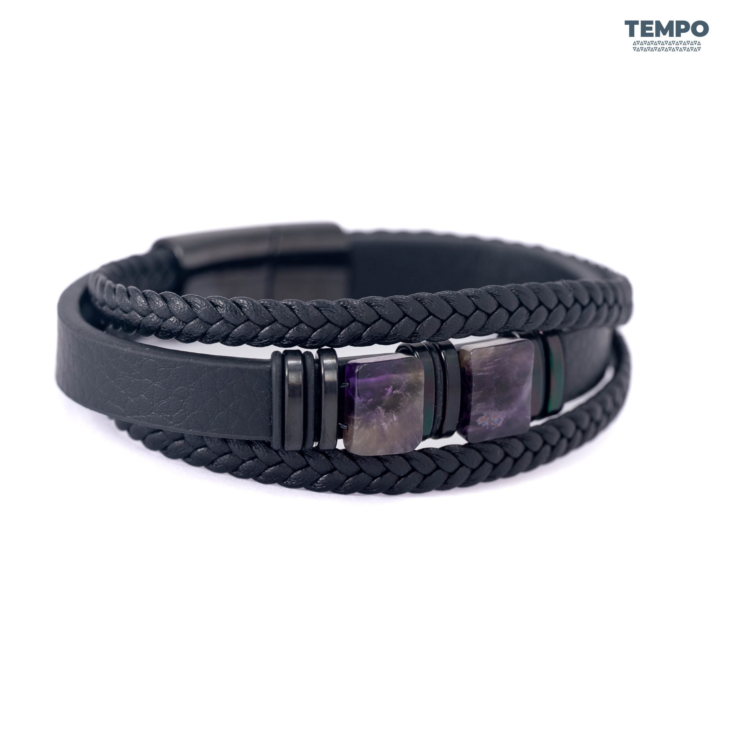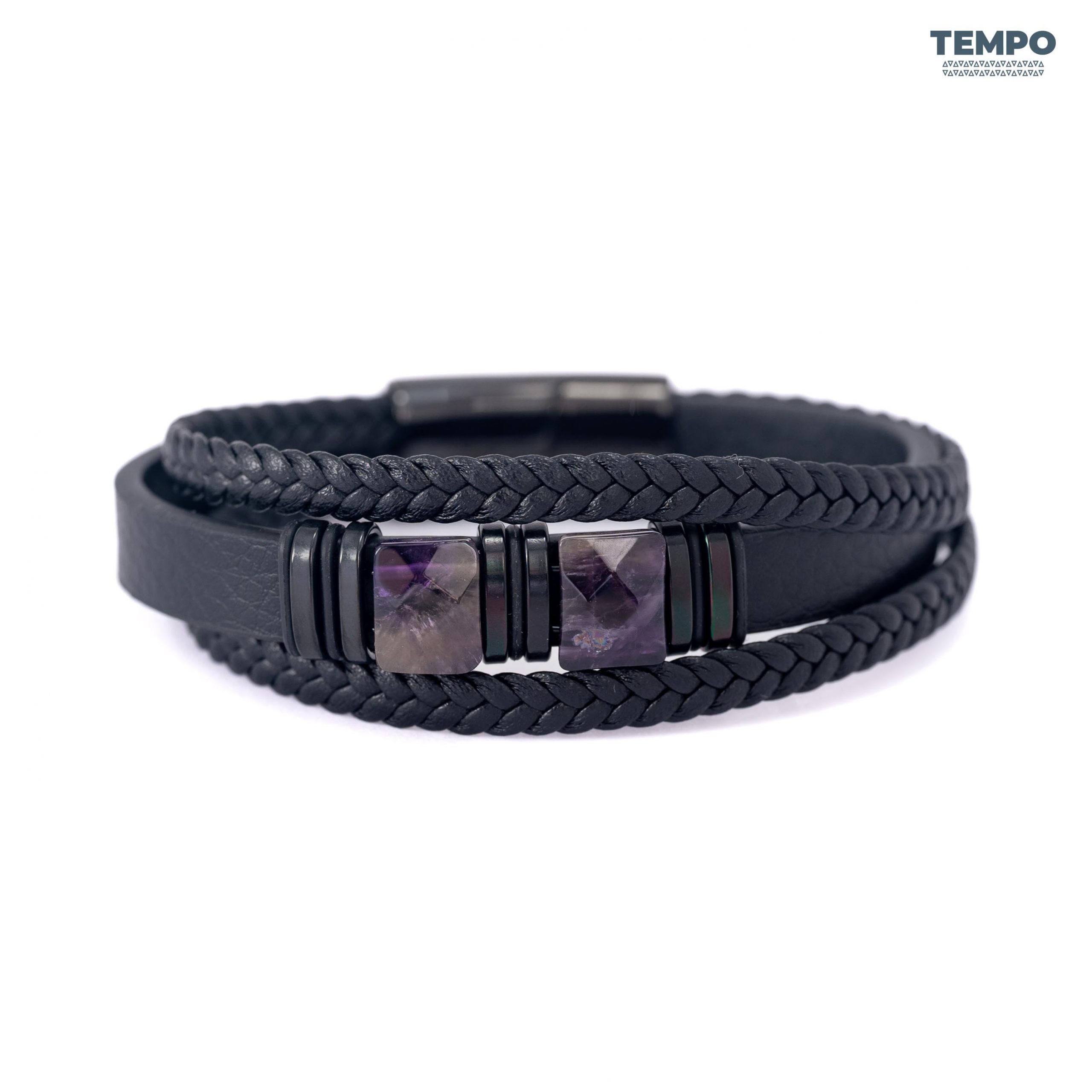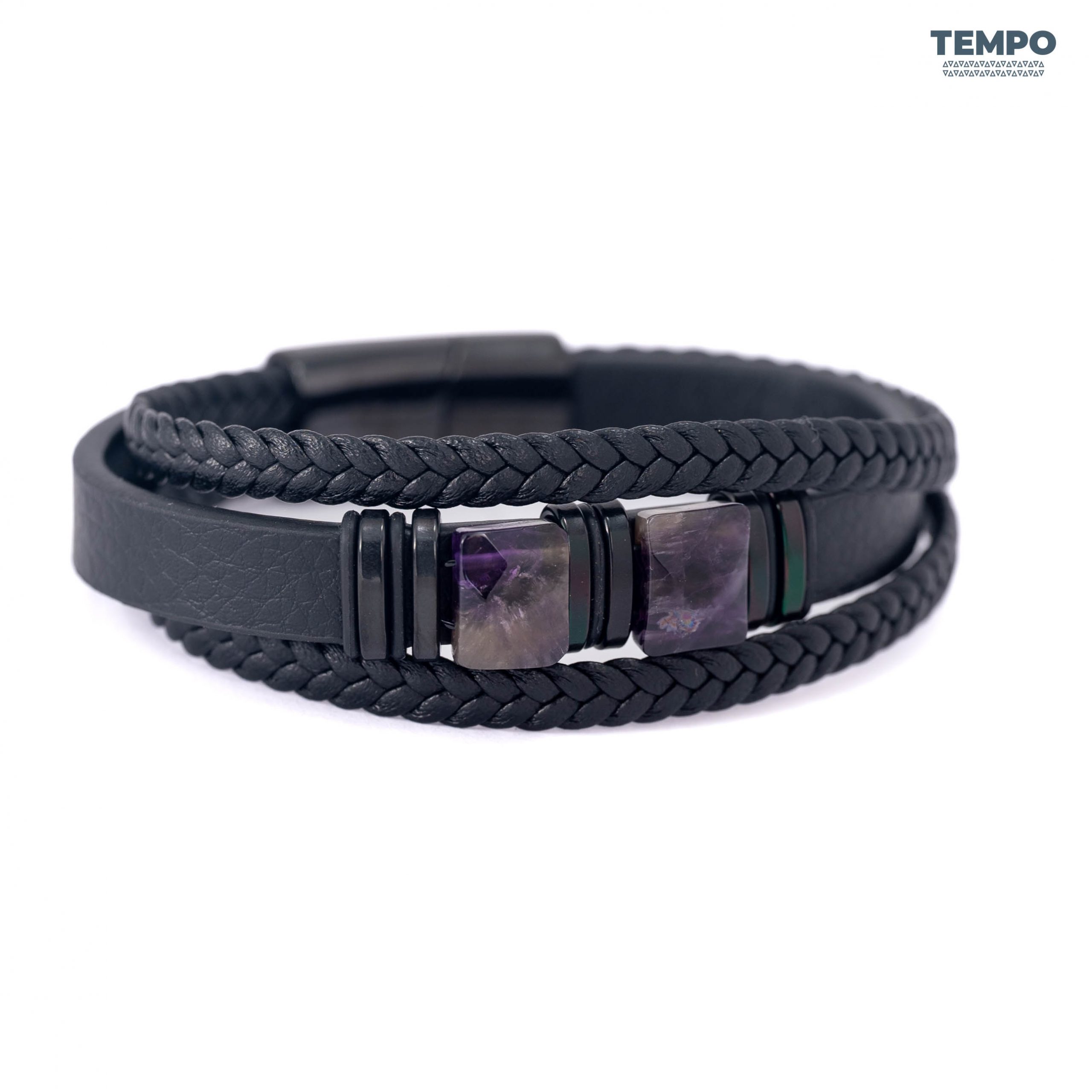 Pulsera masculina de cuero con piedra natural Amatista, conocida por sus tonos púrpura y su apariencia sofisticada. Perfecta para dar un toque elegante y equilibrado a cualquier look, combinando sobriedad y personalidad en un diseño premium.
