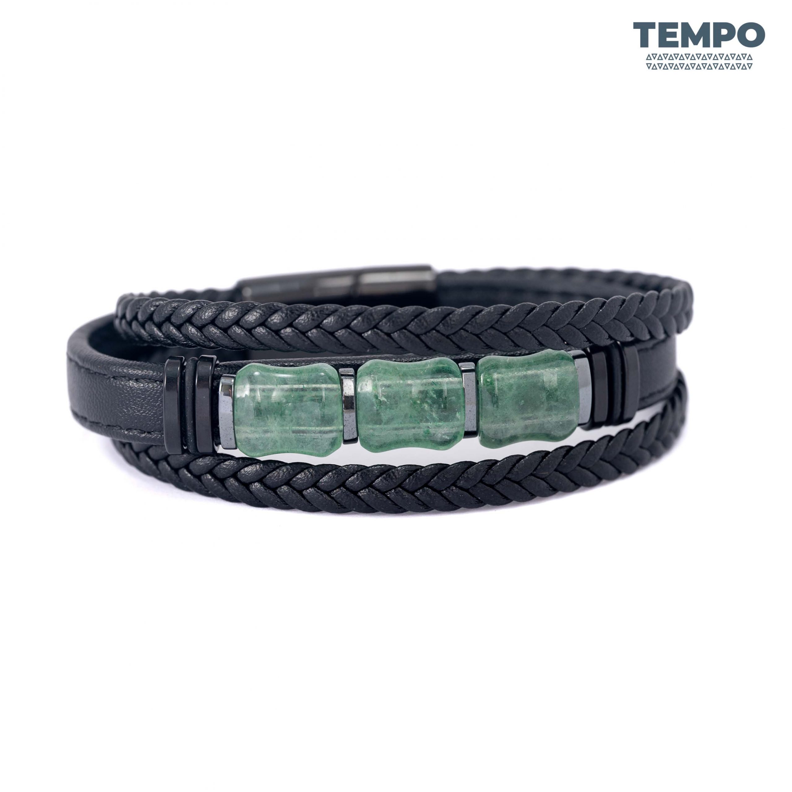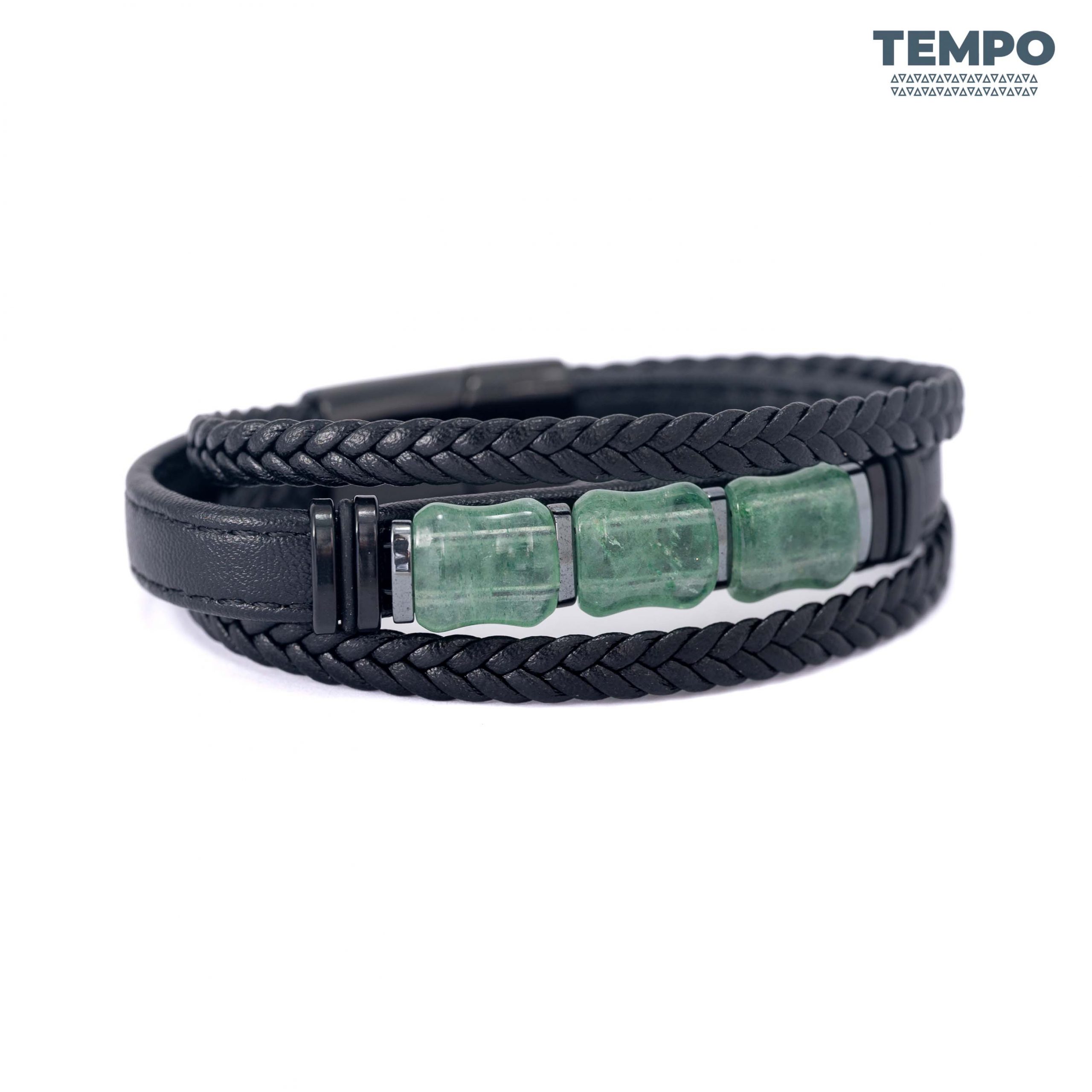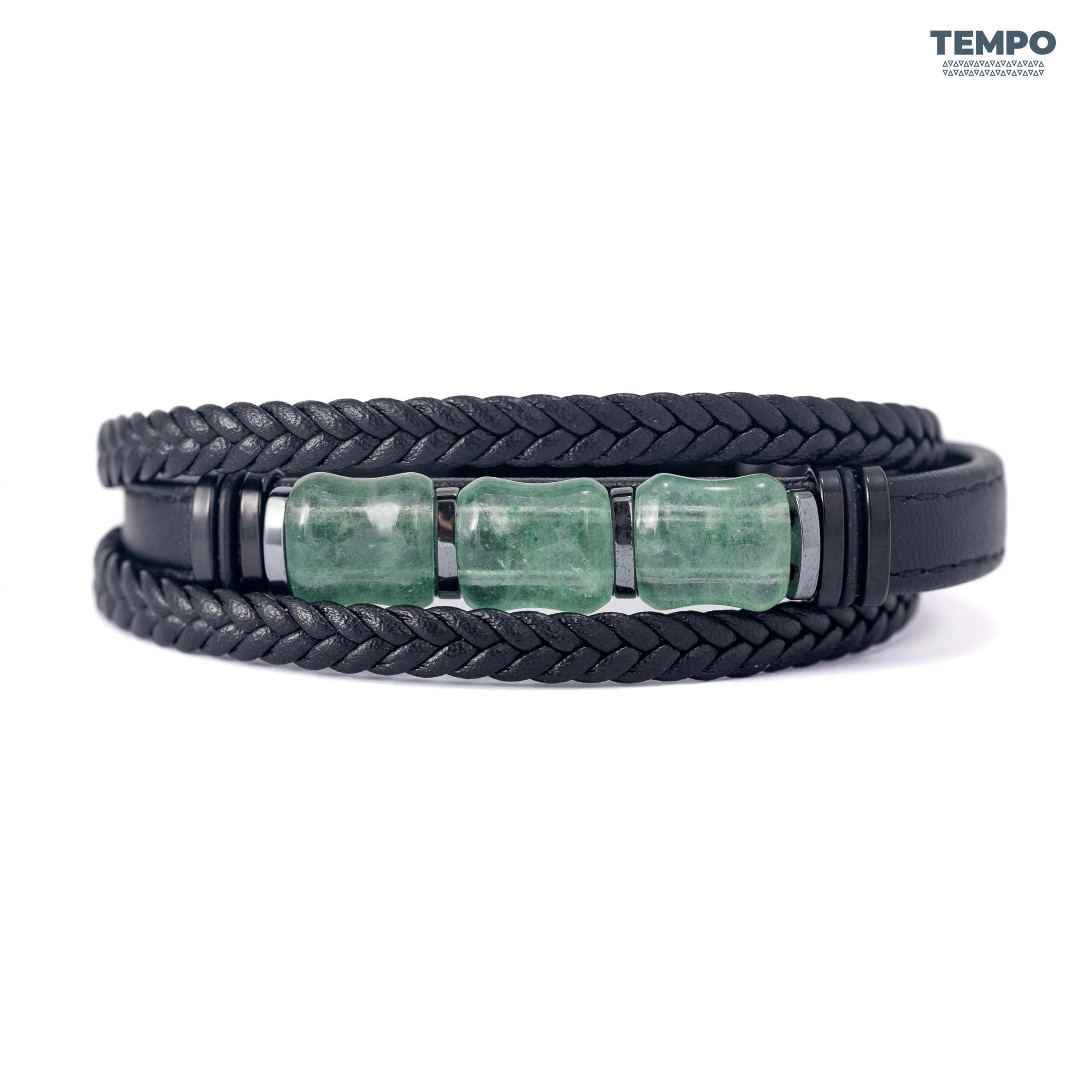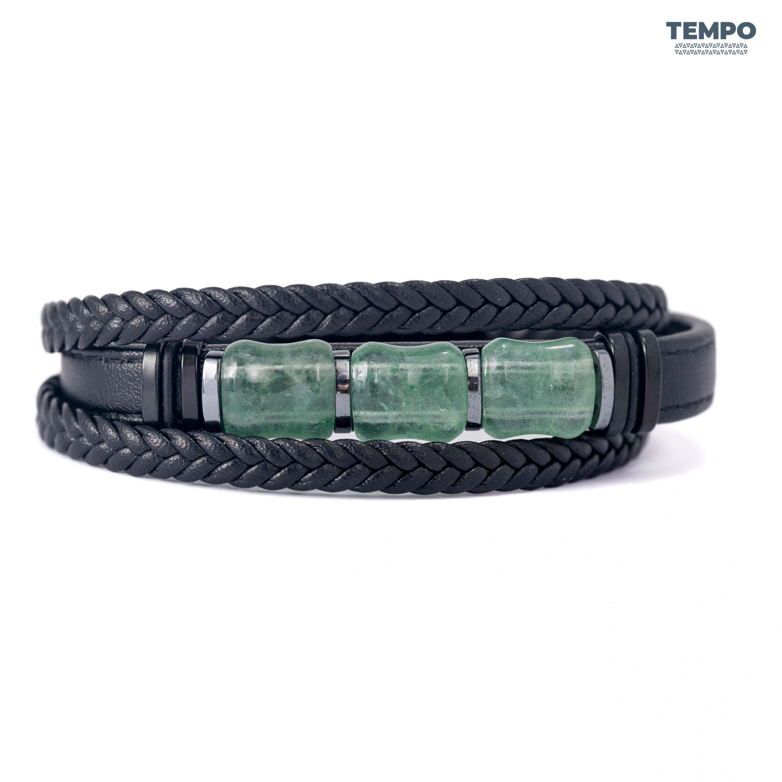 Pulsera para caballero elaborada con piedra natural Granate Verde, un tono profundo que destaca de forma sutil. Combinada con cuero negro, crea un estilo moderno, sobrio y fácil de combinar. Ideal para quienes buscan un detalle elegante y diferente.