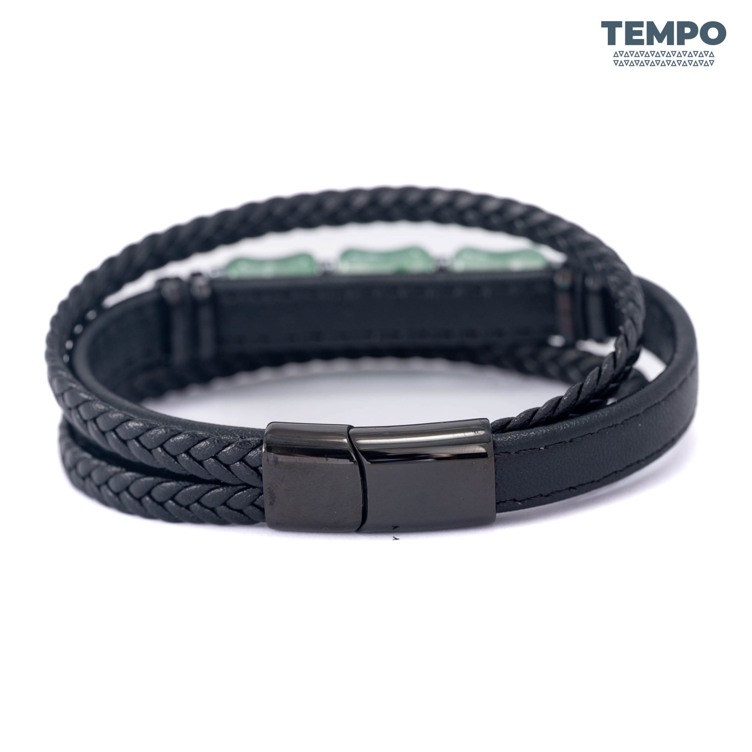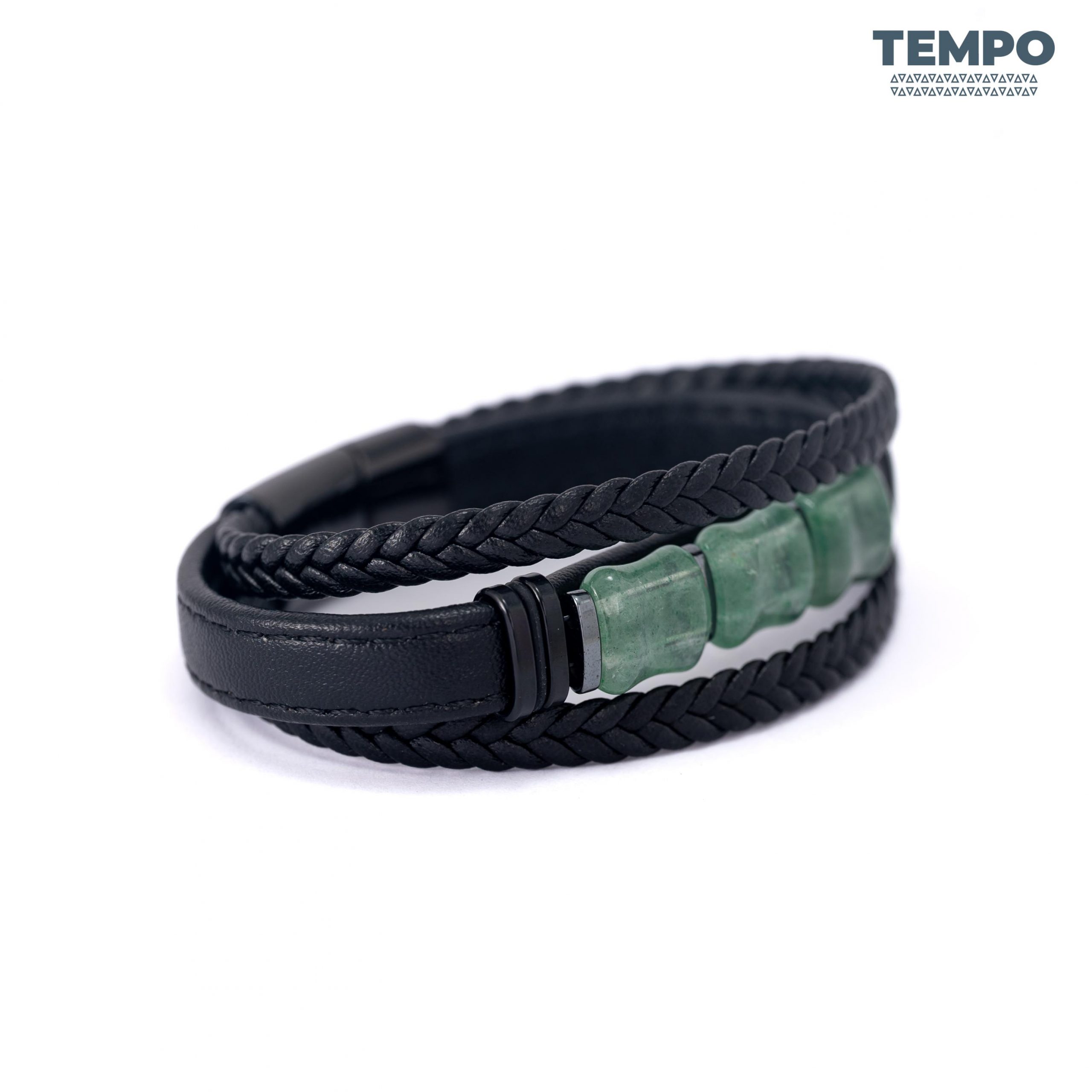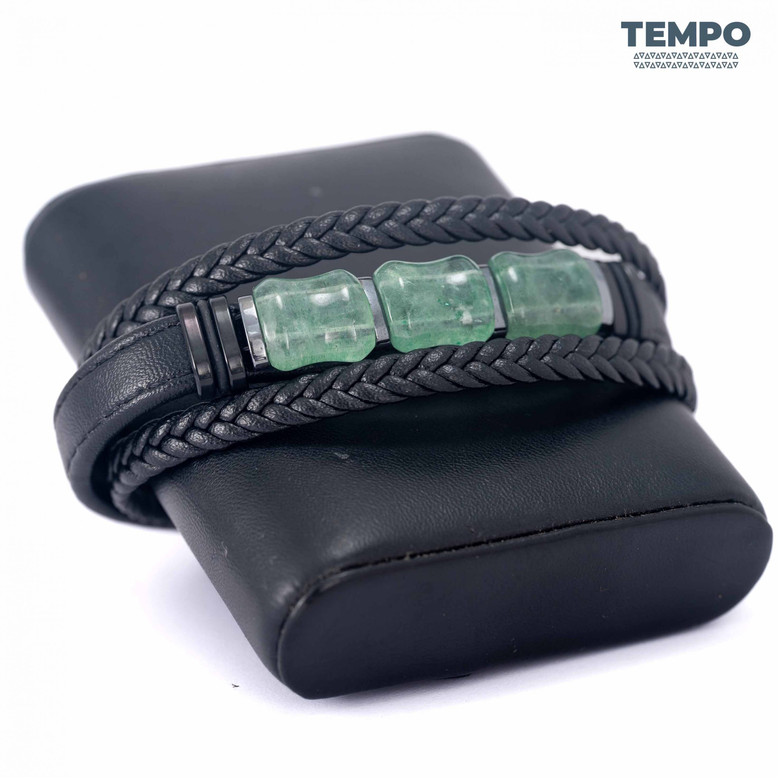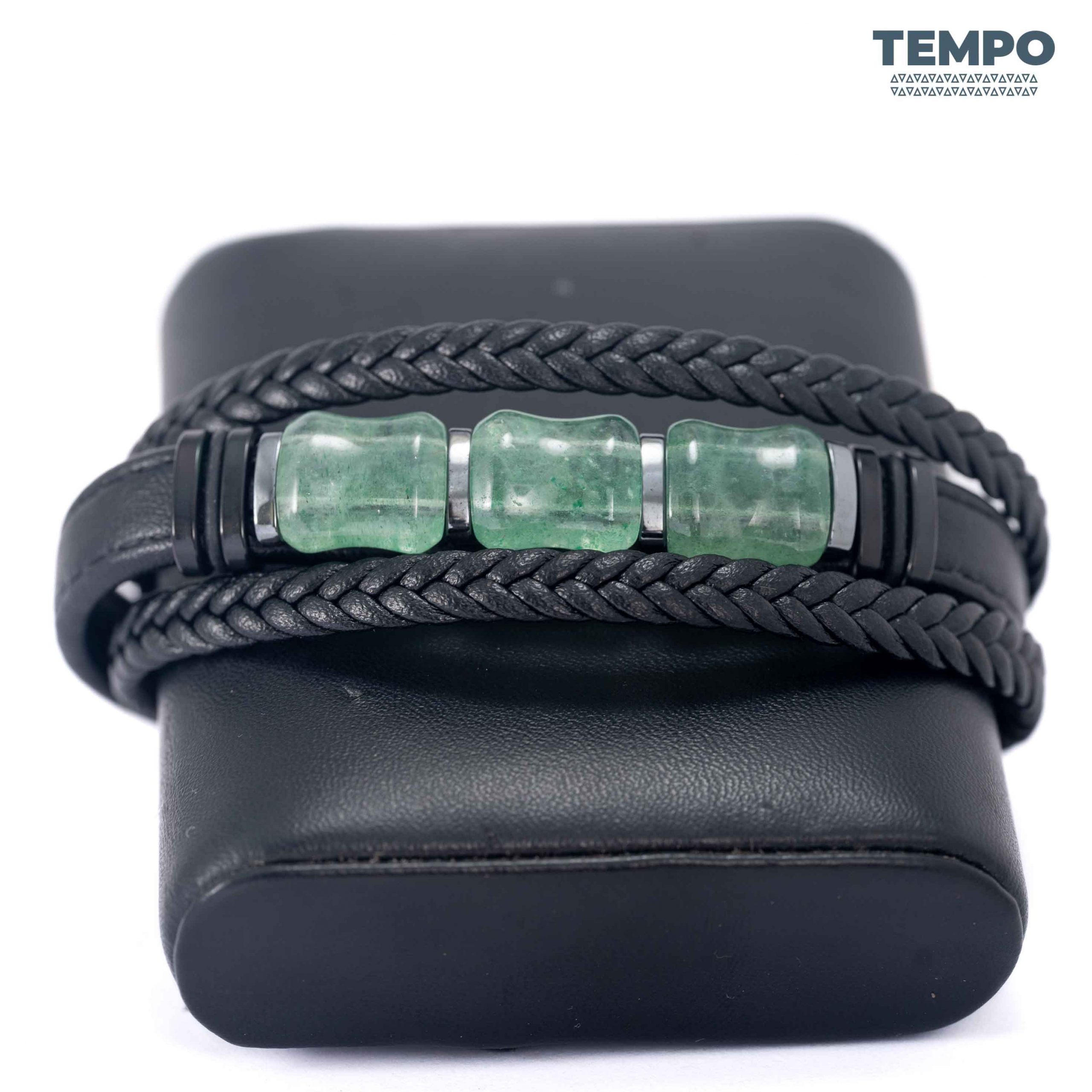 Pulsera para caballero elaborada con piedra natural Granate Verde, un tono profundo que destaca de forma sutil. Combinada con cuero negro, crea un estilo moderno, sobrio y fácil de combinar. Ideal para quienes buscan un detalle elegante y diferente.